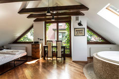 Górny poziom zachwyca wysokością sięgającą aż 337 cm w najwyższym punkcie. Na szczególną uwagę zasługują pięknie wyeksponowane belki stropowe, które nadają wnętrzu niepowtarzalny, ciepły charakter. Znajduje się tu również wanna z hydromasażem, a zieleń za oknem tworzy atmosferę spokoju i bliskości natury.